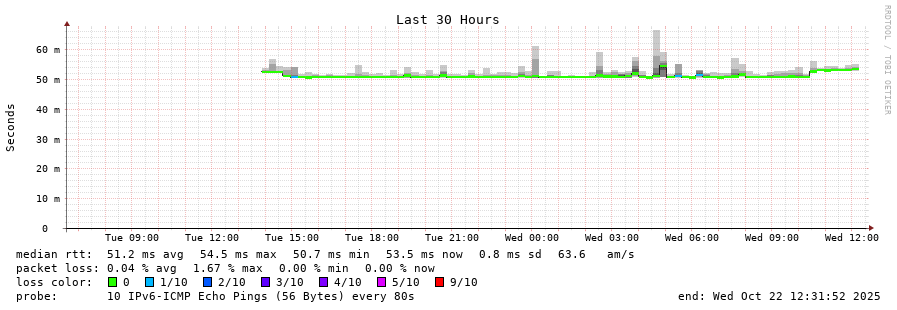 traceroute to 2001:67c:1e0:0:c225:e9ff:fea8:6a0a (2001:67c:1e0:0:c225:e9ff:fea8:6a0a), 30 hops max, 80 byte packets - Generated at 2025-10-22 05:30:01