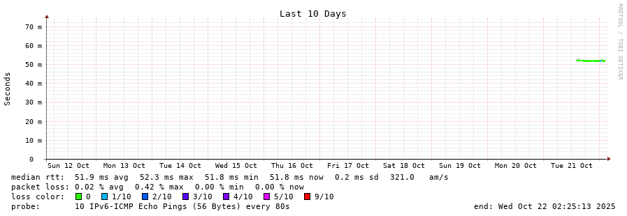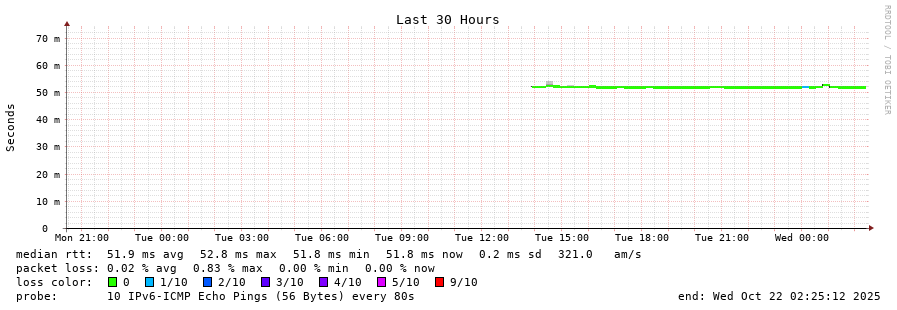 traceroute to 2001:67c:10:1102::11 (2001:67c:10:1102::11), 30 hops max, 80 byte packets - Generated at 2025-10-21 20:30:01