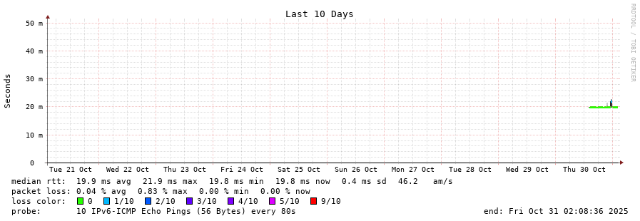 10 > fdff:f000:8:: (fdff:f000:8::) [*] 20.017ms 19.996ms 19.965ms